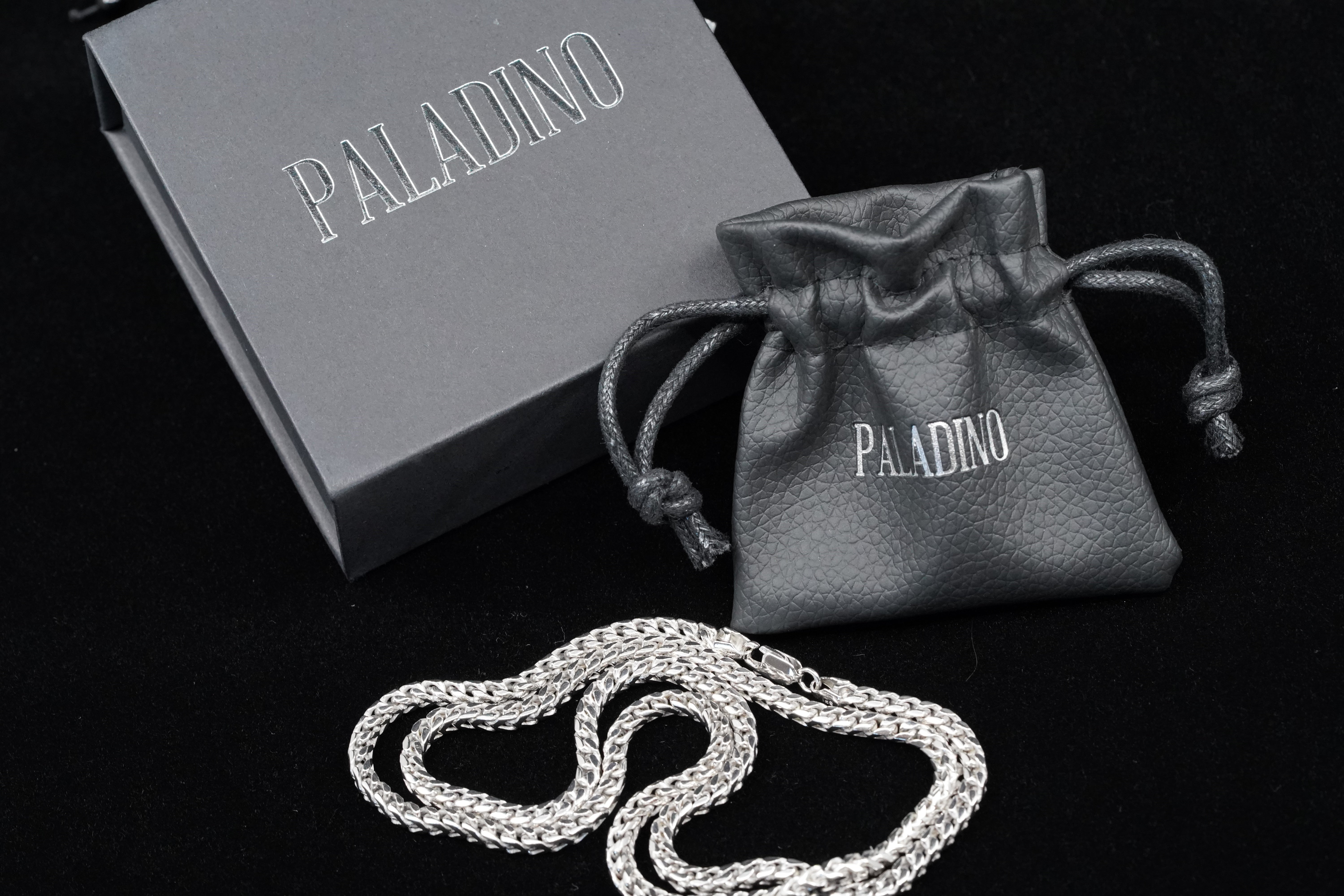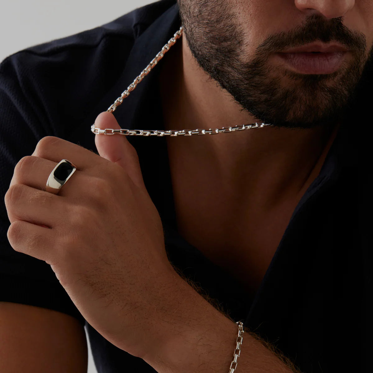 A beautifully made Italian chain, featuring a four-sided link pattern design. It's V shaped links reflect light from every angle, giving it a bold yet refined presence.
